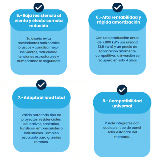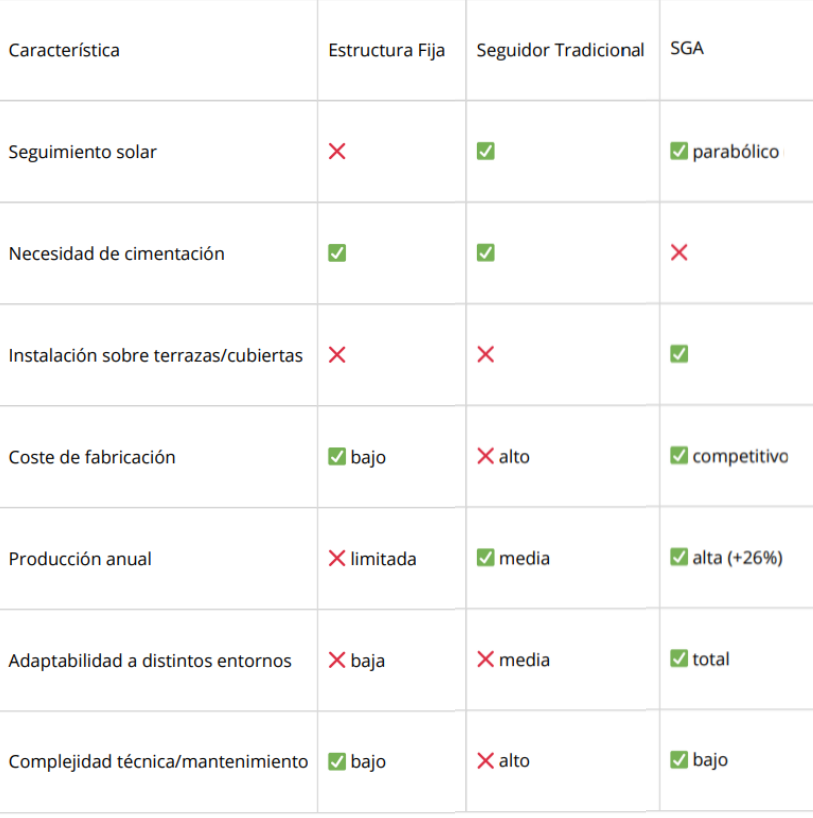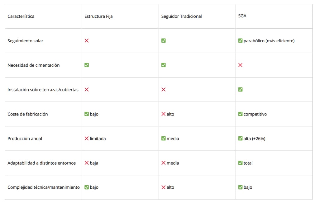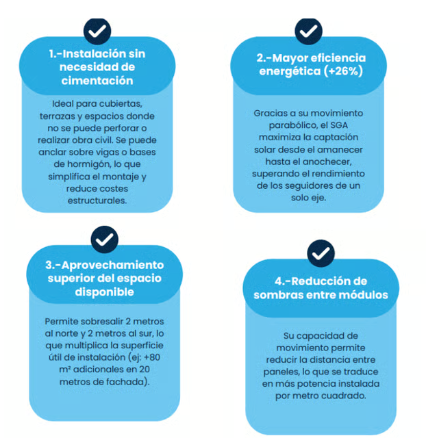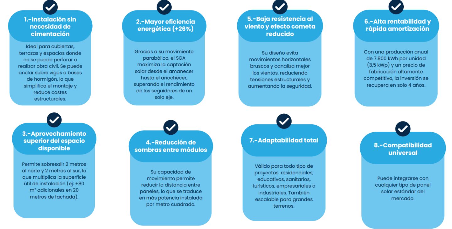 Su estructura giratoria y su diseño modular, de bajo coste de fabricación, hacen del SGA una alternativa competitiva frente a los seguidores tradicionales. Su principal valor añadido: un 26% más de producción anual, mayor aprovechamiento del espacio disponible, y la capacidad de adaptarse a todo tipo de superficies sin obra civil.